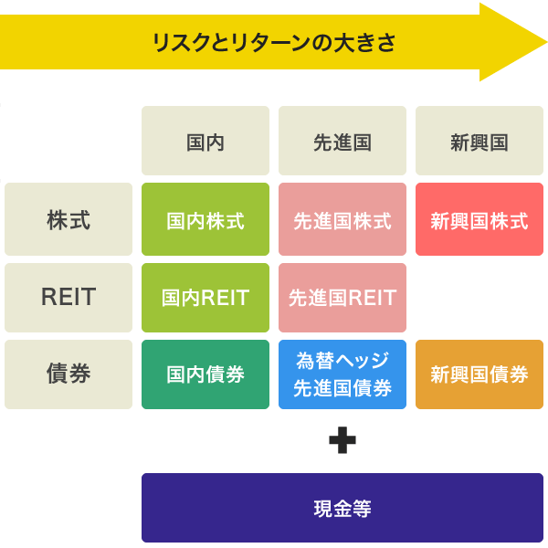 相対的に値動きの大きい先進国や新興国の株式を組み入れるなど積極的にリスクをとり、リターンをねらうポートフォリオ
