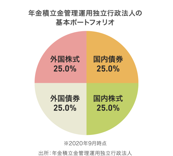 私たちの年金を運用する年金積立金管理運用独立行政法人(GPIF)は、下記の基本比率に基づき投資を行っています。
