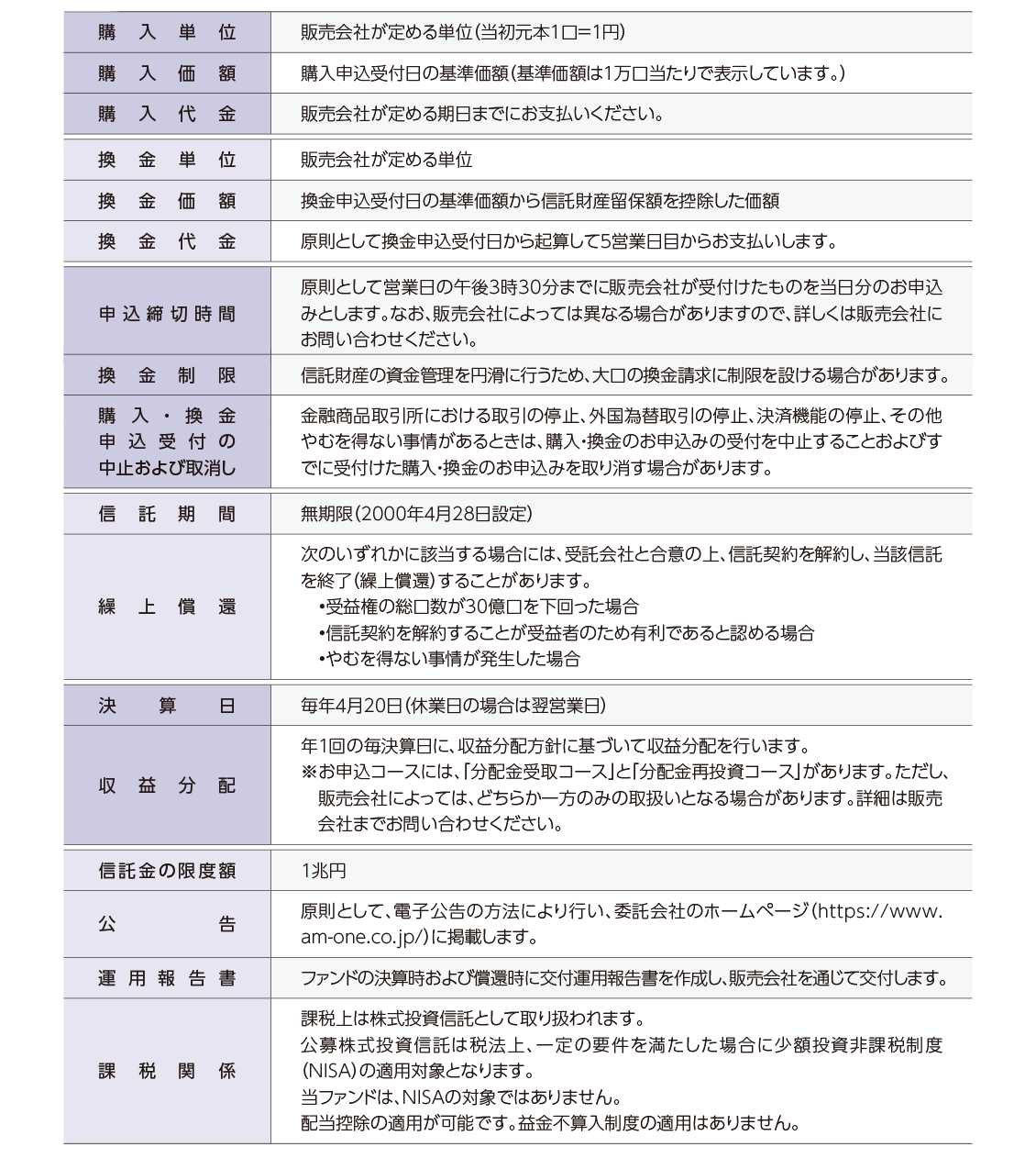 運用状況によっては、分配金額が変わる場合、あるいは分配金が支払われない場合があります。投資信託は、預金等や保険契約ではありません。また、預金保険機構および保険契約者保護機構の保護の対象ではありません。加えて証券会社を通して購入していない場合には投資者保護基金の対象にもなりません。購入金額については元本保証および利回り保証のいずれもありません。投資した資産の価値が減少して購入金額を下回る場合がありますが、これによる損失は購入者が負担することとなります。