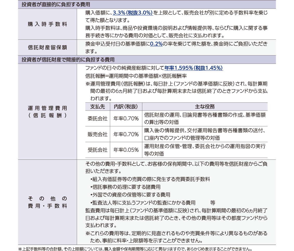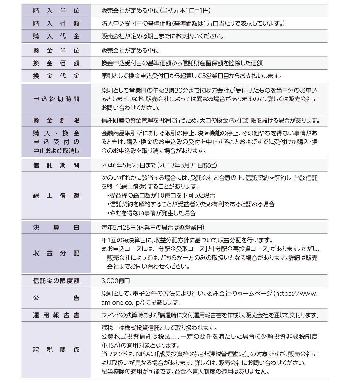 運用状況によっては、分配金額が変わる場合、あるいは分配金が支払われない場合があります。投資信託は、預金等や保険契約ではありません。また、預金保険機構および保険契約者保護機構の保護の対象ではありません。加えて証券会社を通して購入していない場合には投資者保護基金の対象にもなりません。購入金額については元本保証および利回り保証のいずれもありません。投資した資産の価値が減少して購入金額を下回る場合がありますが、これによる損失は購入者が負担することとなります。