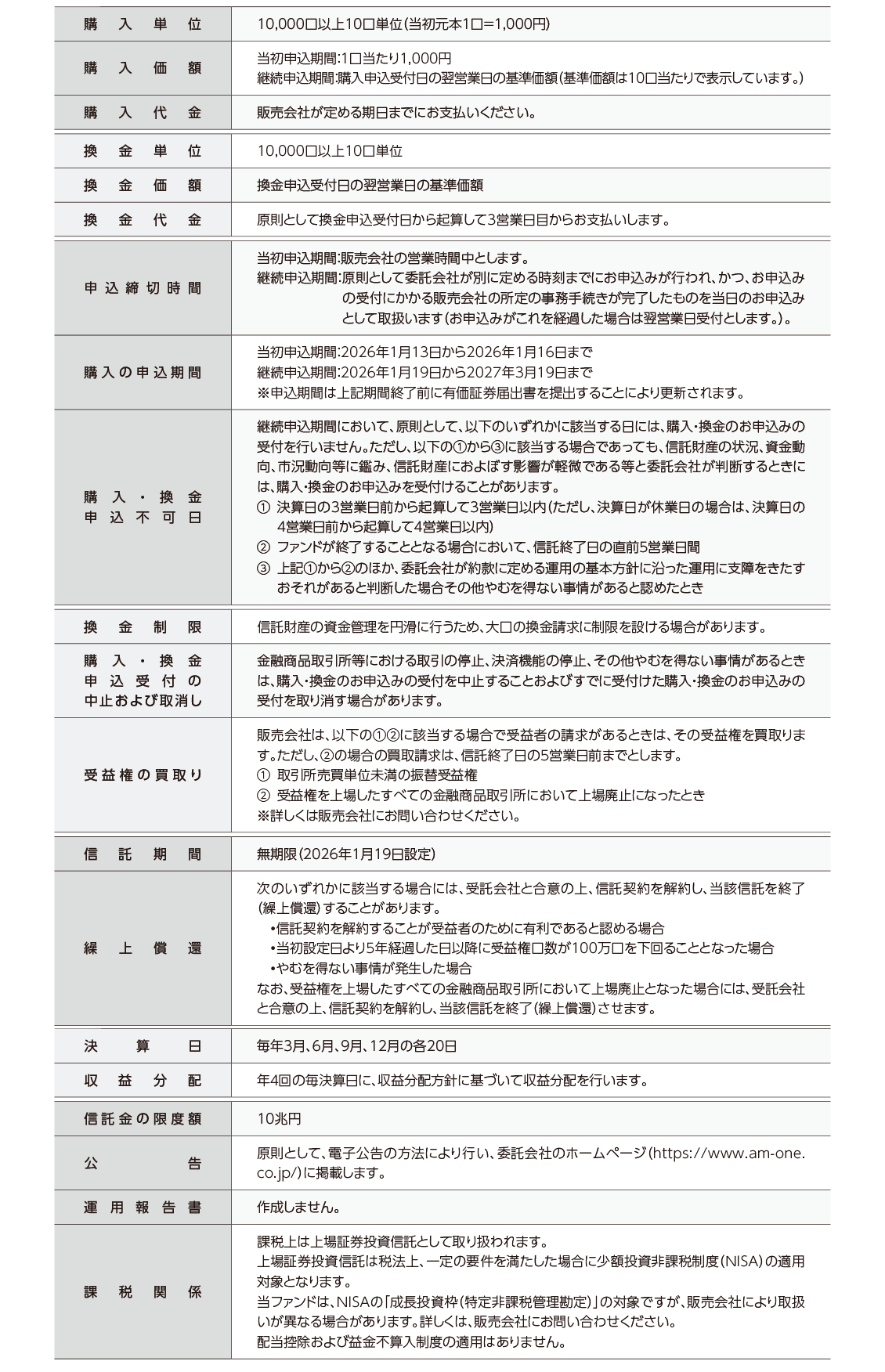 本ウェブサイトは、アセットマネジメントOne株式会社が作成したものです。お申込に際しては、投資信託説明書(交付目論見書)をあらかじめ、または同時にお渡し致しますので、必ず内容をご確認の上、ご自身でご判断ください。投資信託は、株式や債券等の値動きのある有価証券(外貨建資産には為替リスクもあります)に投資をしますので、市場環境、組入有価証券の発行者に係る信用状況等の変化により基準価額は変動します。このため、購入金額について元本保証および利回り保証のいずれもありません。本ウェブサイトは、アセットマネジメントOne株式会社が信頼できると判断したデータにより作成しておりますが、その内容の完全性、正確性について同社が保証するものではありません。また、掲載データは過去の実績であり、将来の運用成果を保証するものではありません。 本ウェブサイトに掲載されている情報(リンクされている外部サイトの情報も含む)に基づいて被ったいかなる損害についても一切の責任を負いません。本ウェブサイトの内容は作成時点のものであり、今後予告なく変更される場合があります。本ウェブサイトに記載した当社の見通し等は、将来の景気や株価等の動きを保証するものではありません。基準価額・分配金再投資基準価額・分配金込み基準価額は信託報酬控除後の価額です。当初元本が1口1円のファンドについては1万口当たりの価額を、それ以外のファンドについては1口あたりの価額を表示しています。換金時の費用・税金等は考慮しておりません。ただし、ETFの表記している口数については別途ご確認ください。分配金の表示数値は、基準価額の表示口数当たり課税前の金額です。表示方法については、公社債投信は小数点第二位まで、その他のファンドは整数部のみとしているため、実際の分配金額と表示上の差異が生じることがあります。運用状況によっては、分配金額が変わる場合、あるいは分配金が支払われない場合があります。投資信託は、預金等や保険契約ではありません。また、預金保険機構および保険契約者保護機構の保護の対象ではありません。加えて証券会社を通して購入していない場合には投資者保護基金の対象にもなりません。購入金額については元本保証および利回り保証のいずれもありません。投資した資産の価値が減少して購入金額を下回る場合がありますが、これによる損失は購入者が負担することとなります。