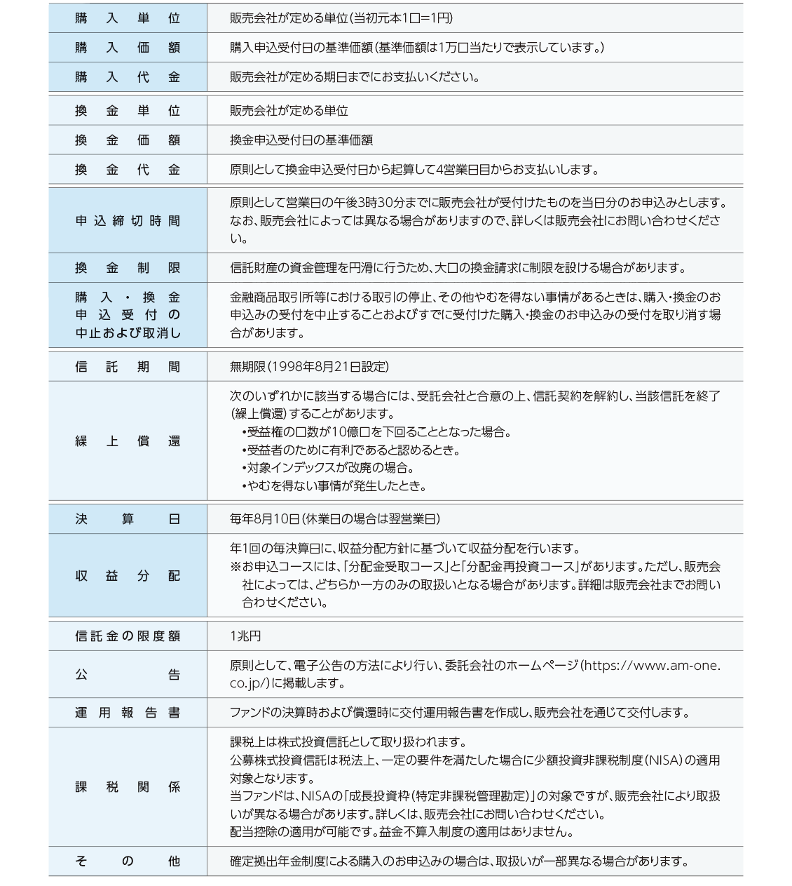 運用状況によっては、分配金額が変わる場合、あるいは分配金が支払われない場合があります。投資信託は、預金等や保険契約ではありません。また、預金保険機構および保険契約者保護機構の保護の対象ではありません。加えて証券会社を通して購入していない場合には投資者保護基金の対象にもなりません。購入金額については元本保証および利回り保証のいずれもありません。投資した資産の価値が減少して購入金額を下回る場合がありますが、これによる損失は購入者が負担することとなります。