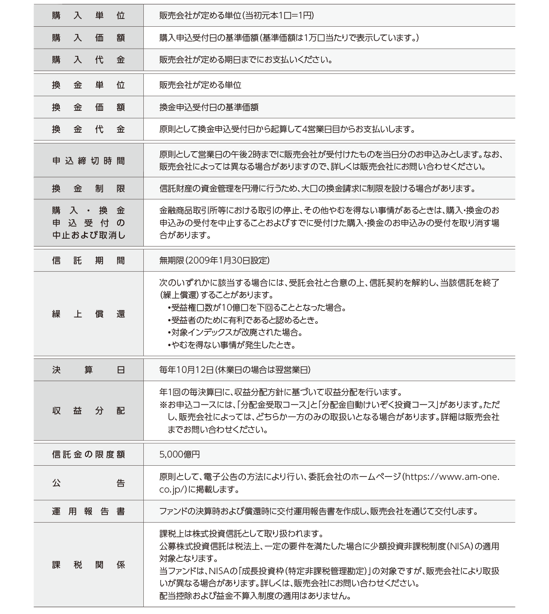 運用状況によっては、分配金額が変わる場合、あるいは分配金が支払われない場合があります。投資信託は、預金等や保険契約ではありません。また、預金保険機構および保険契約者保護機構の保護の対象ではありません。加えて証券会社を通して購入していない場合には投資者保護基金の対象にもなりません。購入金額については元本保証および利回り保証のいずれもありません。投資した資産の価値が減少して購入金額を下回る場合がありますが、これによる損失は購入者が負担することとなります。
