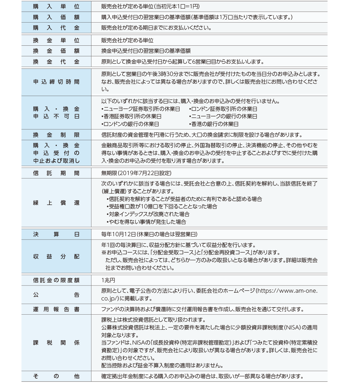 運用状況によっては、分配金額が変わる場合、あるいは分配金が支払われない場合があります。投資信託は、預金等や保険契約ではありません。また、預金保険機構および保険契約者保護機構の保護の対象ではありません。加えて証券会社を通して購入していない場合には投資者保護基金の対象にもなりません。購入金額については元本保証および利回り保証のいずれもありません。投資した資産の価値が減少して購入金額を下回る場合がありますが、これによる損失は購入者が負担することとなります。
