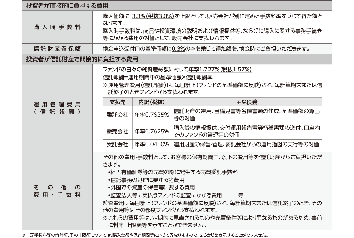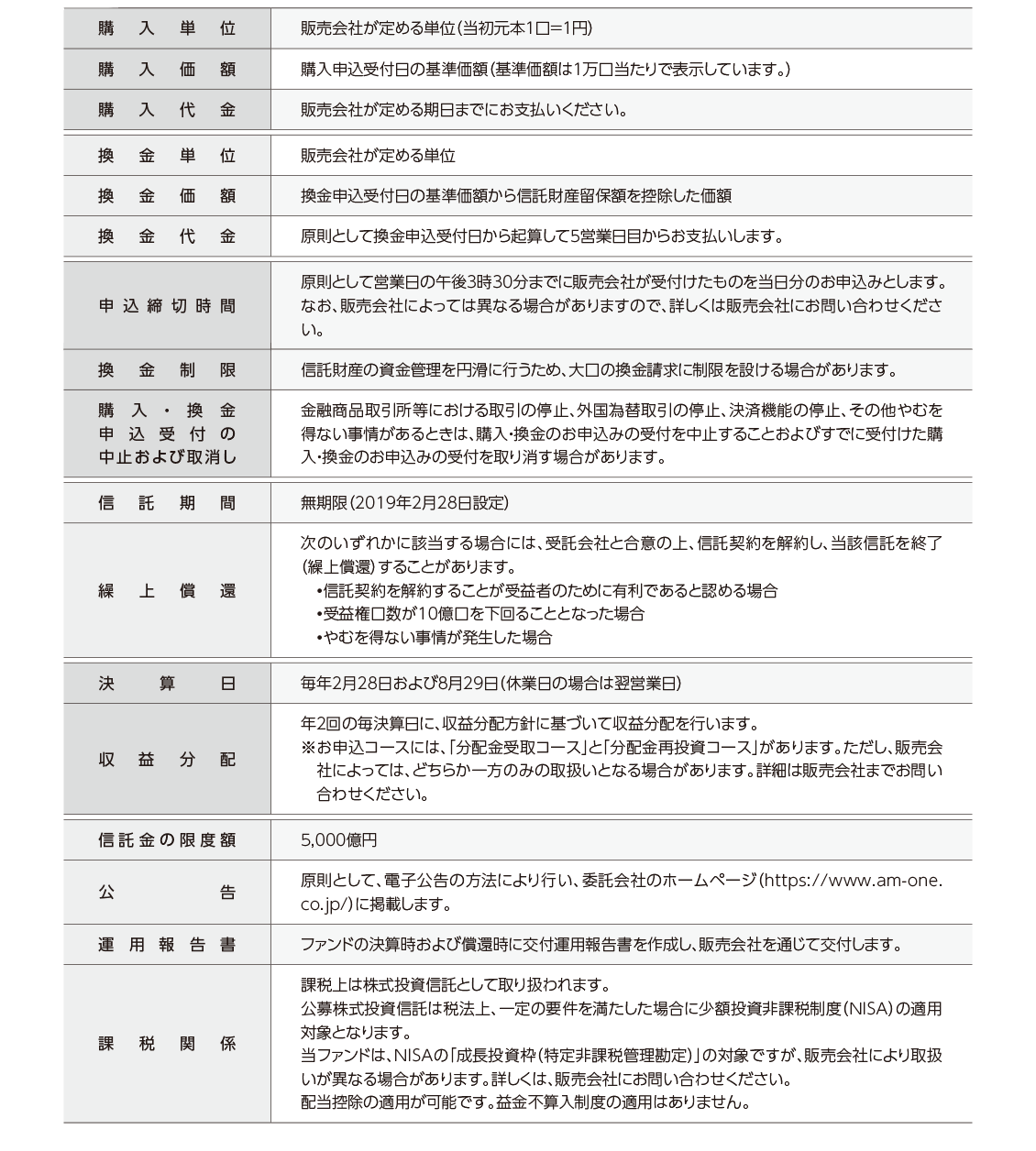 運用状況によっては、分配金額が変わる場合、あるいは分配金が支払われない場合があります。投資信託は、預金等や保険契約ではありません。また、預金保険機構および保険契約者保護機構の保護の対象ではありません。加えて証券会社を通して購入していない場合には投資者保護基金の対象にもなりません。購入金額については元本保証および利回り保証のいずれもありません。投資した資産の価値が減少して購入金額を下回る場合がありますが、これによる損失は購入者が負担することとなります。