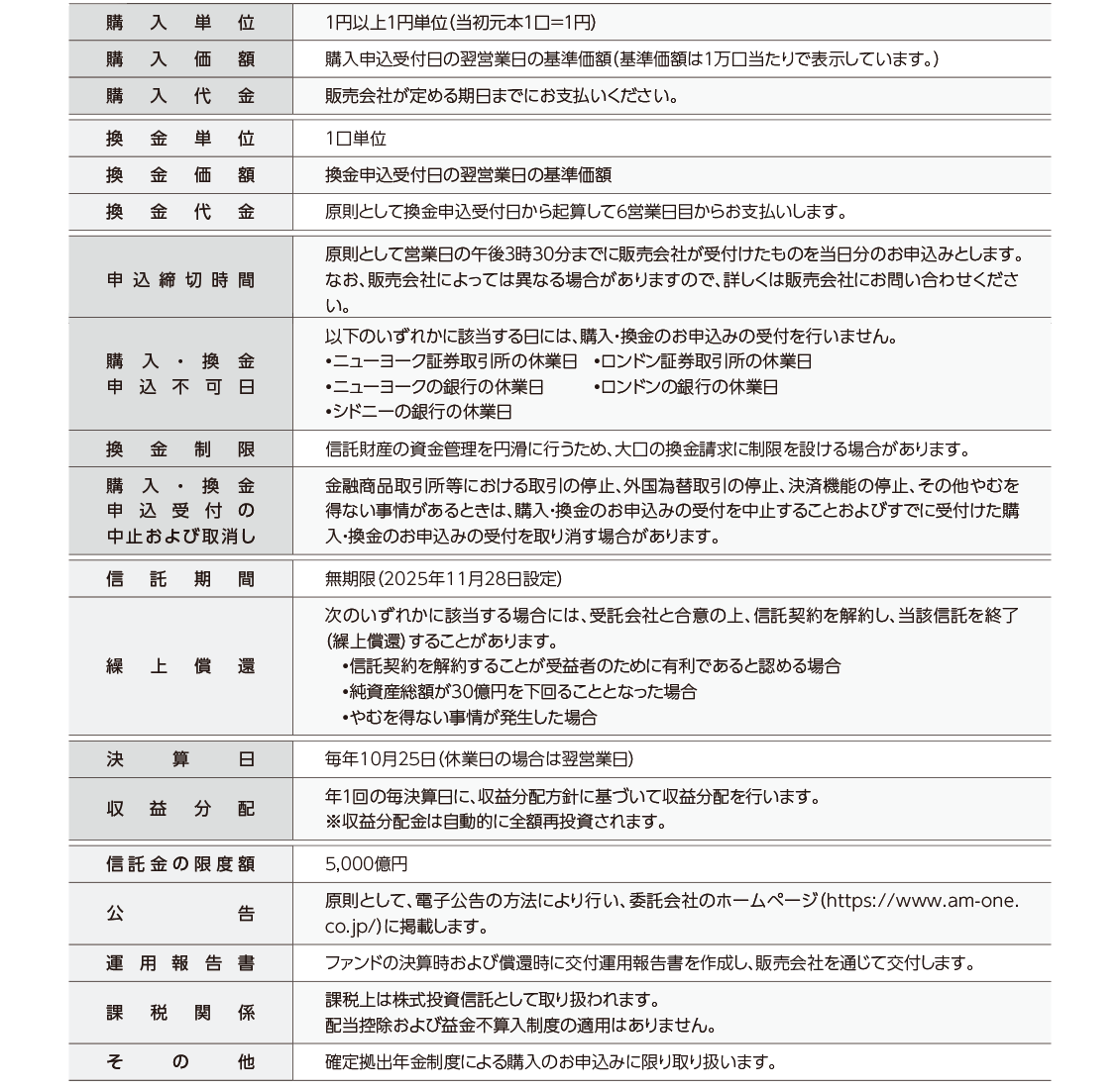 本ウェブサイトは、アセットマネジメントOne株式会社が作成したものです。お申込に際しては、投資信託説明書(交付目論見書)をあらかじめ、または同時にお渡し致しますので、必ず内容をご確認の上、ご自身でご判断ください。投資信託は、株式や債券等の値動きのある有価証券(外貨建資産には為替リスクもあります)に投資をしますので、市場環境、組入有価証券の発行者に係る信用状況等の変化により基準価額は変動します。このため、購入金額について元本保証および利回り保証のいずれもありません。本ウェブサイトは、アセットマネジメントOne株式会社が信頼できると判断したデータにより作成しておりますが、その内容の完全性、正確性について同社が保証するものではありません。また、掲載データは過去の実績であり、将来の運用成果を保証するものではありません。 本ウェブサイトに掲載されている情報(リンクされている外部サイトの情報も含む)に基づいて被ったいかなる損害についても一切の責任を負いません。本ウェブサイトの内容は作成時点のものであり、今後予告なく変更される場合があります。本ウェブサイトに記載した当社の見通し等は、将来の景気や株価等の動きを保証するものではありません。基準価額・分配金再投資基準価額・分配金込み基準価額は信託報酬控除後の価額です。当初元本が1口1円のファンドについては1万口当たりの価額を、それ以外のファンドについては1口あたりの価額を表示しています。換金時の費用・税金等は考慮しておりません。ただし、ETFの表記している口数については別途ご確認ください。分配金の表示数値は、基準価額の表示口数当たり課税前の金額です。表示方法については、公社債投信は小数点第二位まで、その他のファンドは整数部のみとしているため、実際の分配金額と表示上の差異が生じることがあります。運用状況によっては、分配金額が変わる場合、あるいは分配金が支払われない場合があります。投資信託は、預金等や保険契約ではありません。また、預金保険機構および保険契約者保護機構の保護の対象ではありません。加えて証券会社を通して購入していない場合には投資者保護基金の対象にもなりません。購入金額については元本保証および利回り保証のいずれもありません。投資した資産の価値が減少して購入金額を下回る場合がありますが、これによる損失は購入者が負担することとなります。