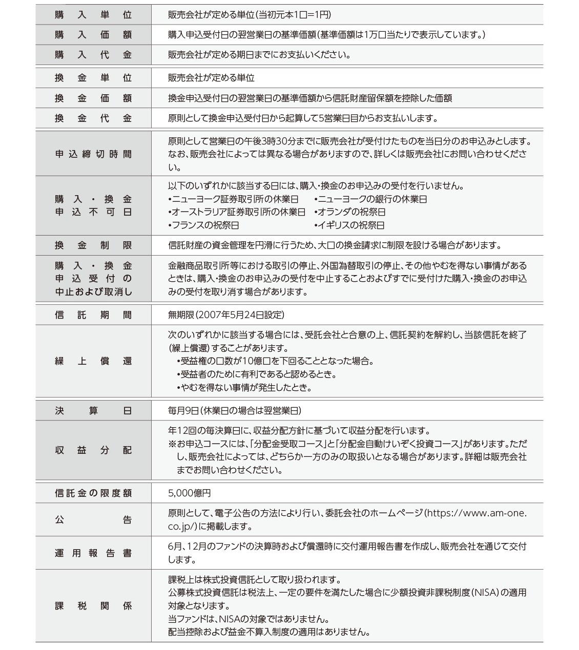 運用状況によっては、分配金額が変わる場合、あるいは分配金が支払われない場合があります。投資信託は、預金等や保険契約ではありません。また、預金保険機構および保険契約者保護機構の保護の対象ではありません。加えて証券会社を通して購入していない場合には投資者保護基金の対象にもなりません。購入金額については元本保証および利回り保証のいずれもありません。投資した資産の価値が減少して購入金額を下回る場合がありますが、これによる損失は購入者が負担することとなります。