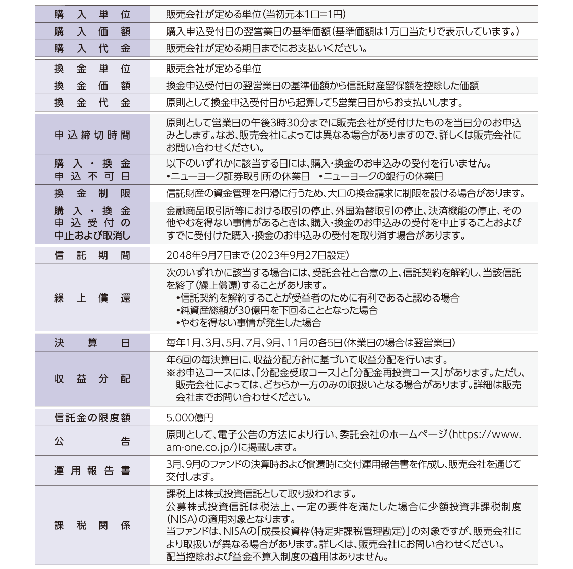 運用状況によっては、分配金額が変わる場合、あるいは分配金が支払われない場合があります。投資信託は、預金等や保険契約ではありません。また、預金保険機構および保険契約者保護機構の保護の対象ではありません。加えて証券会社を通して購入していない場合には投資者保護基金の対象にもなりません。購入金額については元本保証および利回り保証のいずれもありません。投資した資産の価値が減少して購入金額を下回る場合がありますが、これによる損失は購入者が負担することとなります。
