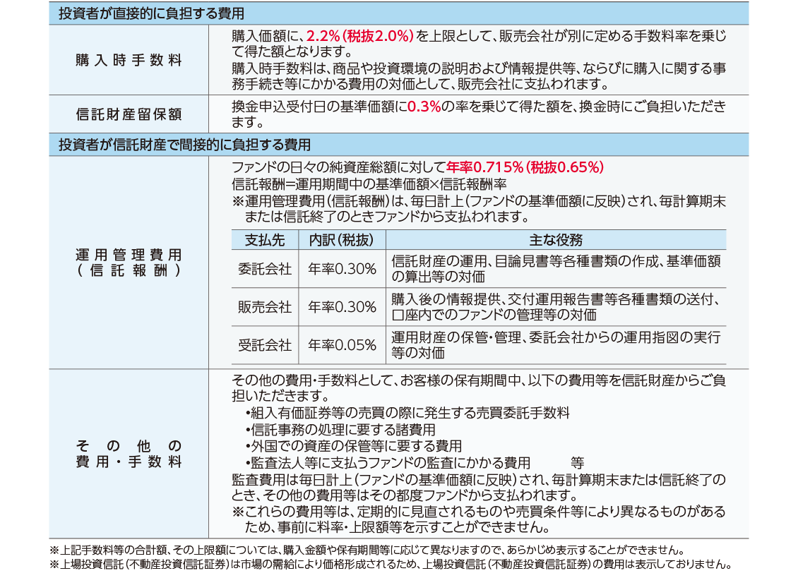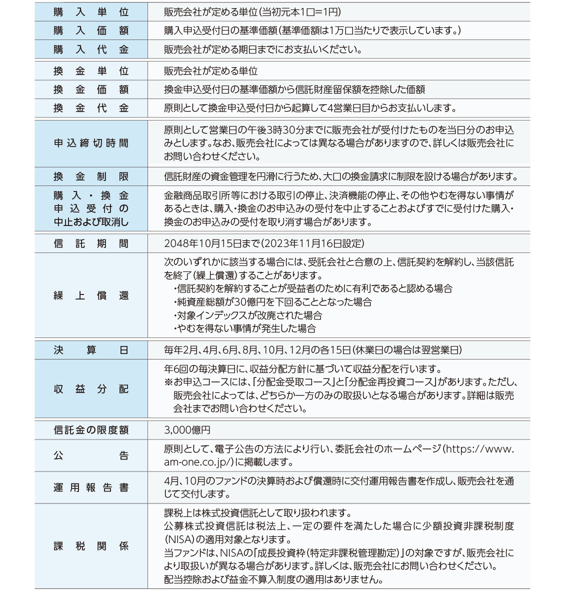 運用状況によっては、分配金額が変わる場合、あるいは分配金が支払われない場合があります。投資信託は、預金等や保険契約ではありません。また、預金保険機構および保険契約者保護機構の保護の対象ではありません。加えて証券会社を通して購入していない場合には投資者保護基金の対象にもなりません。購入金額については元本保証および利回り保証のいずれもありません。投資した資産の価値が減少して購入金額を下回る場合がありますが、これによる損失は購入者が負担することとなります。