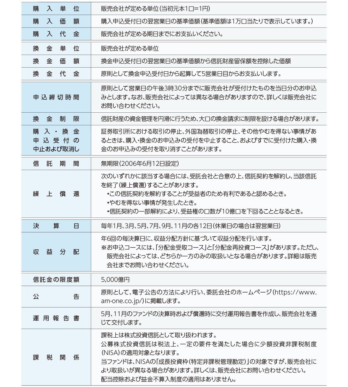 運用状況によっては、分配金額が変わる場合、あるいは分配金が支払われない場合があります。投資信託は、預金等や保険契約ではありません。また、預金保険機構および保険契約者保護機構の保護の対象ではありません。加えて証券会社を通して購入していない場合には投資者保護基金の対象にもなりません。購入金額については元本保証および利回り保証のいずれもありません。投資した資産の価値が減少して購入金額を下回る場合がありますが、これによる損失は購入者が負担することとなります。