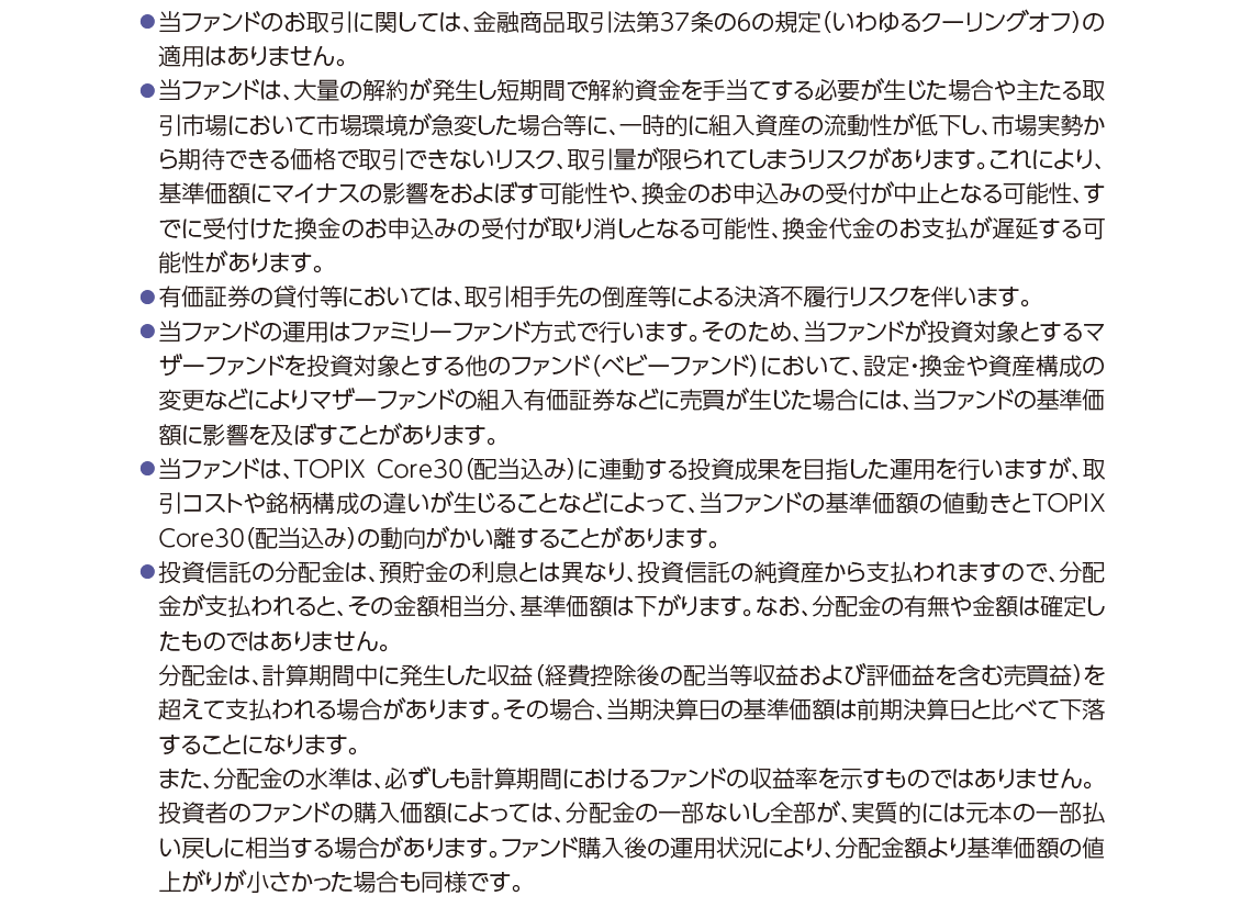 商品分類:追加型投信/国内/株式/インデックス型 日経新聞掲載名:コア30 決算日:毎年11月15日