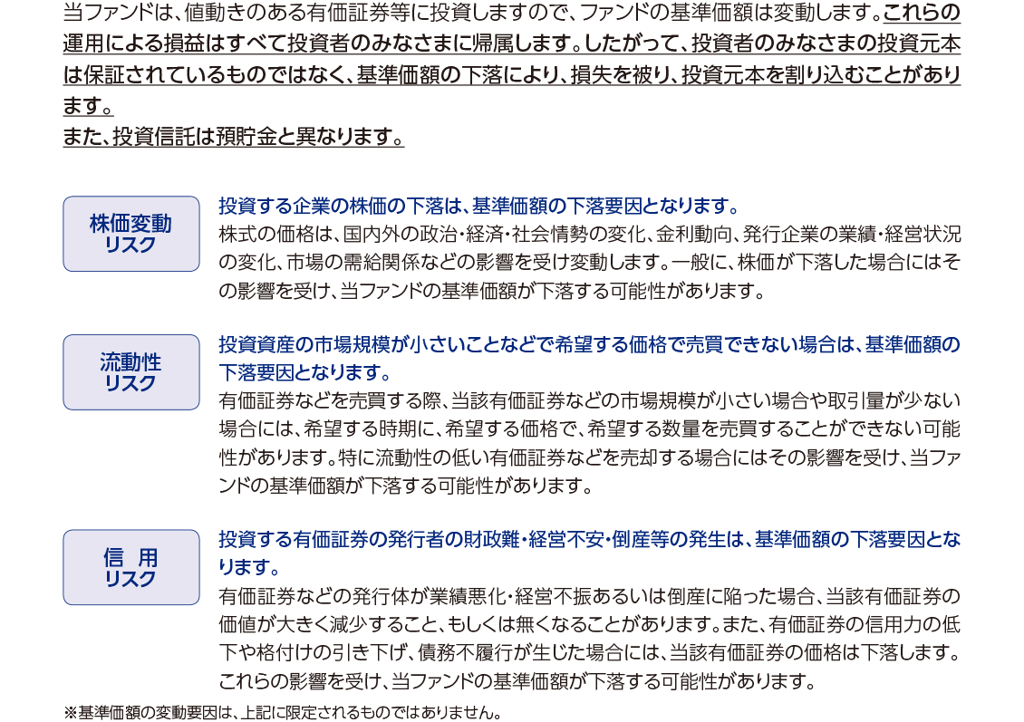 投資信託は、株式や債券等の値動きのある有価証券(外貨建資産には為替リスクもあります)に投資をしますので、市場環境、組入有価証券の発行者に係る信用状況等の変化により基準価額は変動します。このため、購入金額について元本保証および利回り保証のいずれもありません。