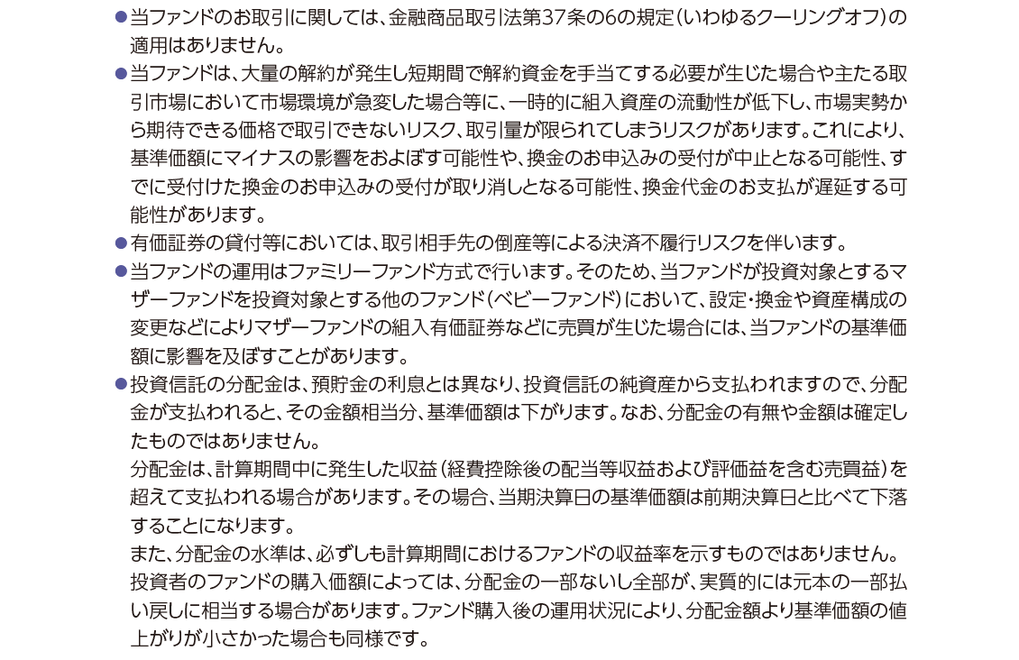 運用状況によっては、分配金額が変わる場合、あるいは分配金が支払われない場合があります。投資信託は、預金等や保険契約ではありません。また、預金保険機構および保険契約者保護機構の保護の対象ではありません。加えて証券会社を通して購入していない場合には投資者保護基金の対象にもなりません。購入金額については元本保証および利回り保証のいずれもありません。投資した資産の価値が減少して購入金額を下回る場合がありますが、これによる損失は購入者が負担することとなります。
