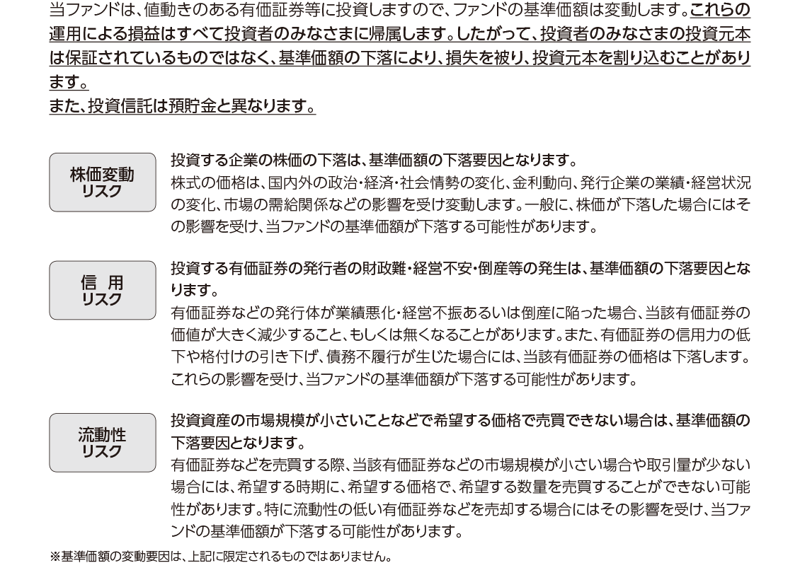 投資信託は、株式や債券等の値動きのある有価証券(外貨建資産には為替リスクもあります)に投資をしますので、市場環境、組入有価証券の発行者に係る信用状況等の変化により基準価額は変動します。このため、購入金額について元本保証および利回り保証のいずれもありません。