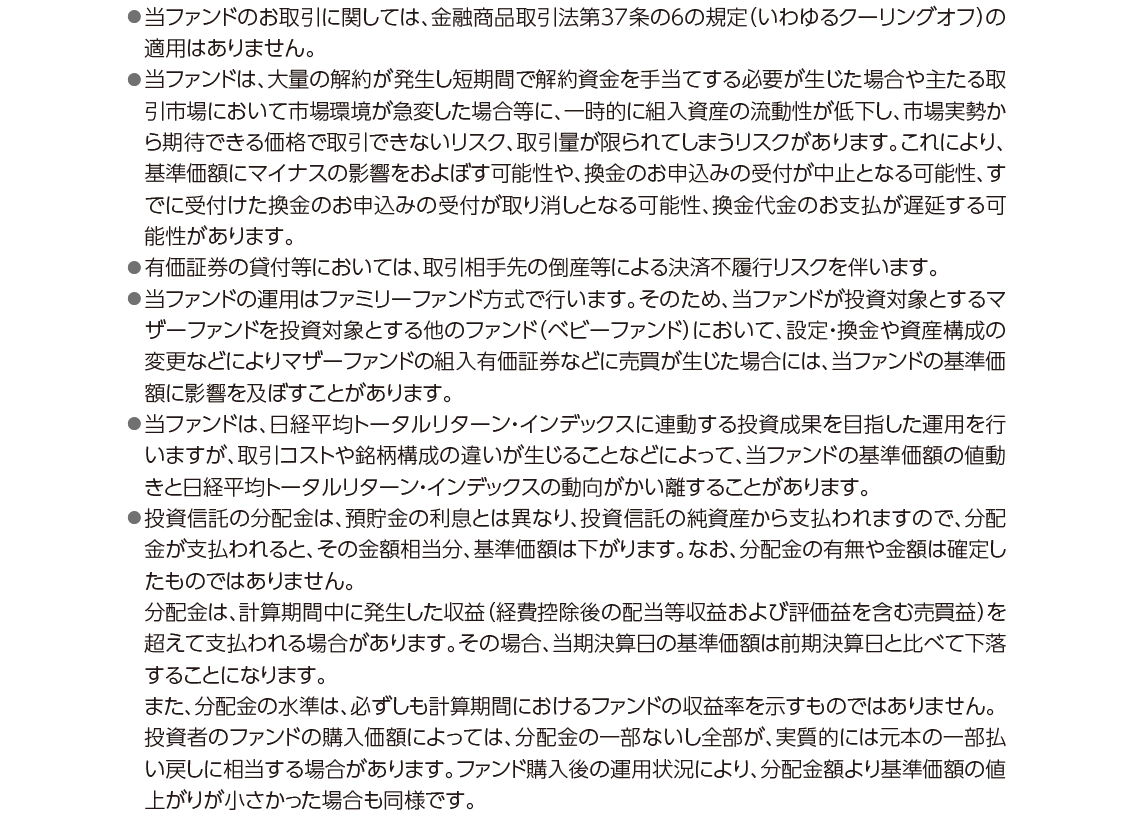 運用状況によっては、分配金額が変わる場合、あるいは分配金が支払われない場合があります。投資信託は、預金等や保険契約ではありません。また、預金保険機構および保険契約者保護機構の保護の対象ではありません。加えて証券会社を通して購入していない場合には投資者保護基金の対象にもなりません。購入金額については元本保証および利回り保証のいずれもありません。投資した資産の価値が減少して購入金額を下回る場合がありますが、これによる損失は購入者が負担することとなります。