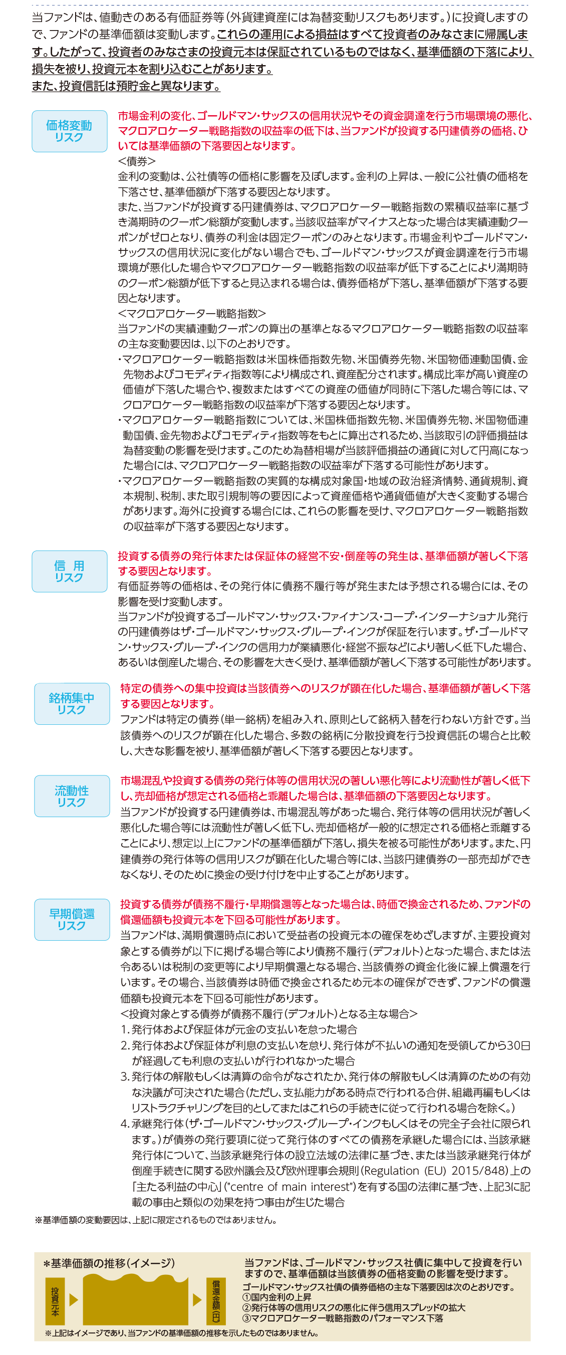 ファンド2023-03(以下「当ファンド」)は、アセットマネジメントOne株式会社(以下「アセットマネジメントOne」)が設定・運用を行います。「ゴールドマン・サックス」は、Goldman Sachs & Co. LLC(. 以下「使用許諾者」)の日本およびその他の国において登録された商標です。アセットマネジメントOneおよびその関連会社は、使用許諾者またはその関連会社・関係会社(以下「ゴールドマン・サックス」と総称)との間に資本関係はありません。ゴールドマン・サックスは、当ファンドの設定または販売に何らの責任も有しておらず、当ファンドの設定または販売にこれまで関与したこともありません。ゴールドマン・サックスは、当ファンドの