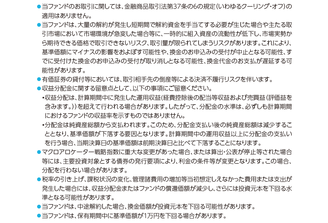 参照戦略スポンサー(ゴールドマン・サックス・インターナショナル)およびそれらの関連会社は、マクロアロケーター戦略指数に関する品質、正確性および/または完全性について、何ら保証するものではありません。また、内容を制限することなく、いかなる場合においても、直接的、間接的、特別、懲罰的、派生的またはその他の損害(逸失利益を含みます。)について、契約、不法行為その他のいずれによるかを問わず、いかなる者に対しても何ら責任を負いません。
