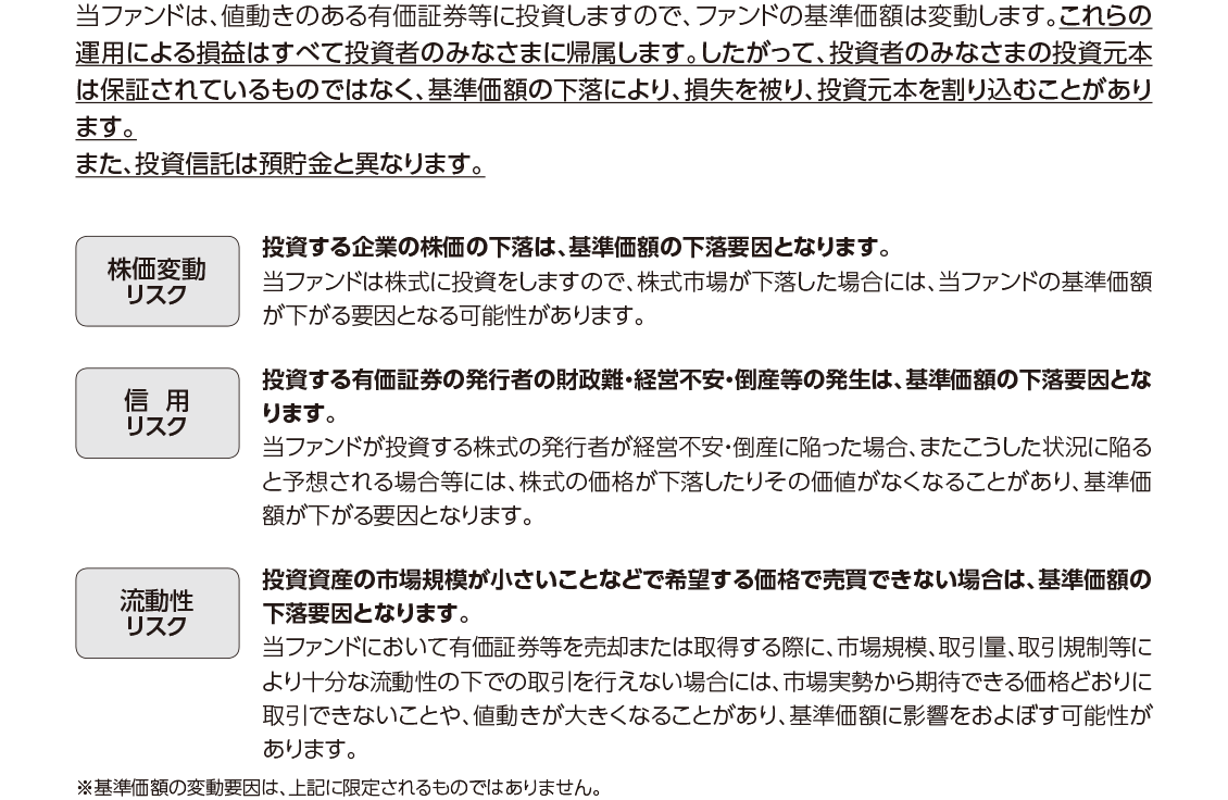 投資信託は、株式や債券等の値動きのある有価証券(外貨建資産には為替リスクもあります)に投資をしますので、市場環境、組入有価証券の発行者に係る信用状況等の変化により基準価額は変動します。このため、購入金額について元本保証および利回り保証のいずれもありません。