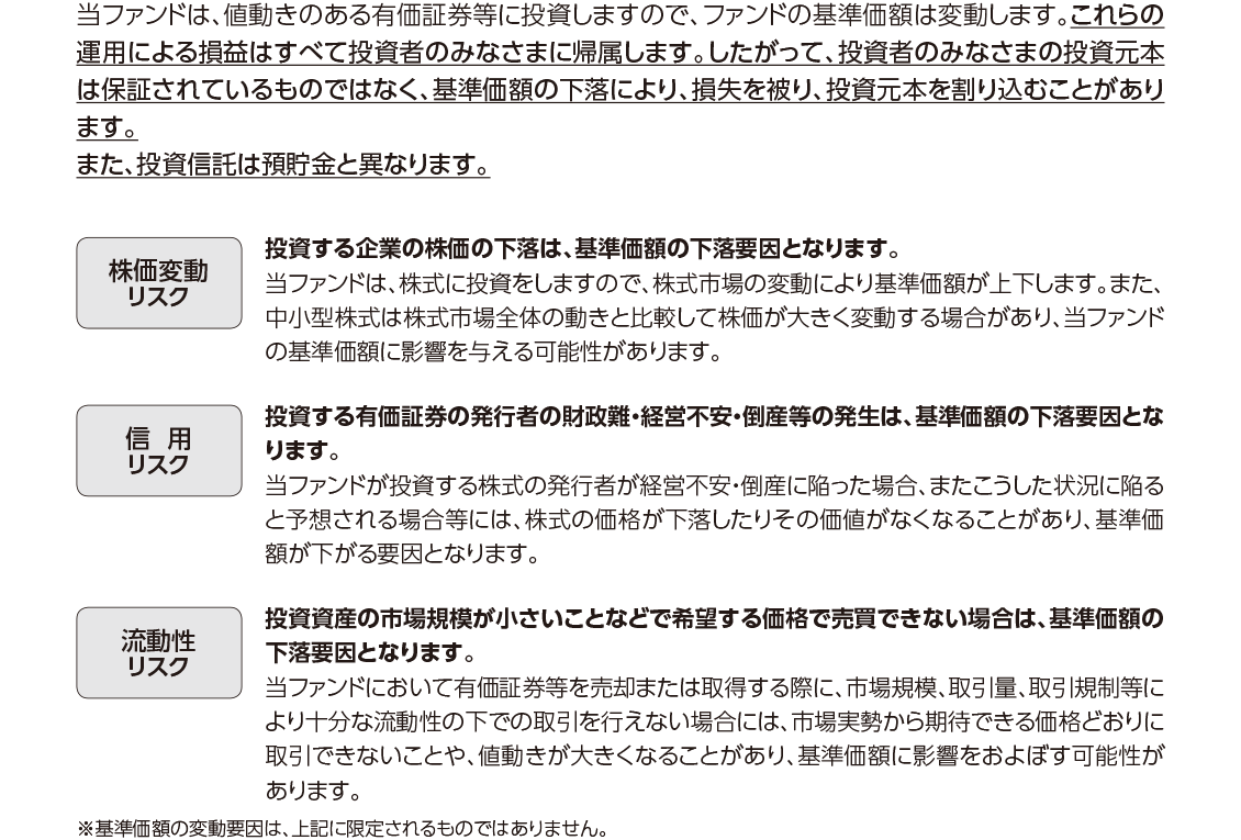 投資信託は、株式や債券等の値動きのある有価証券(外貨建資産には為替リスクもあります)に投資をしますので、市場環境、組入有価証券の発行者に係る信用状況等の変化により基準価額は変動します。このため、購入金額について元本保証および利回り保証のいずれもありません。