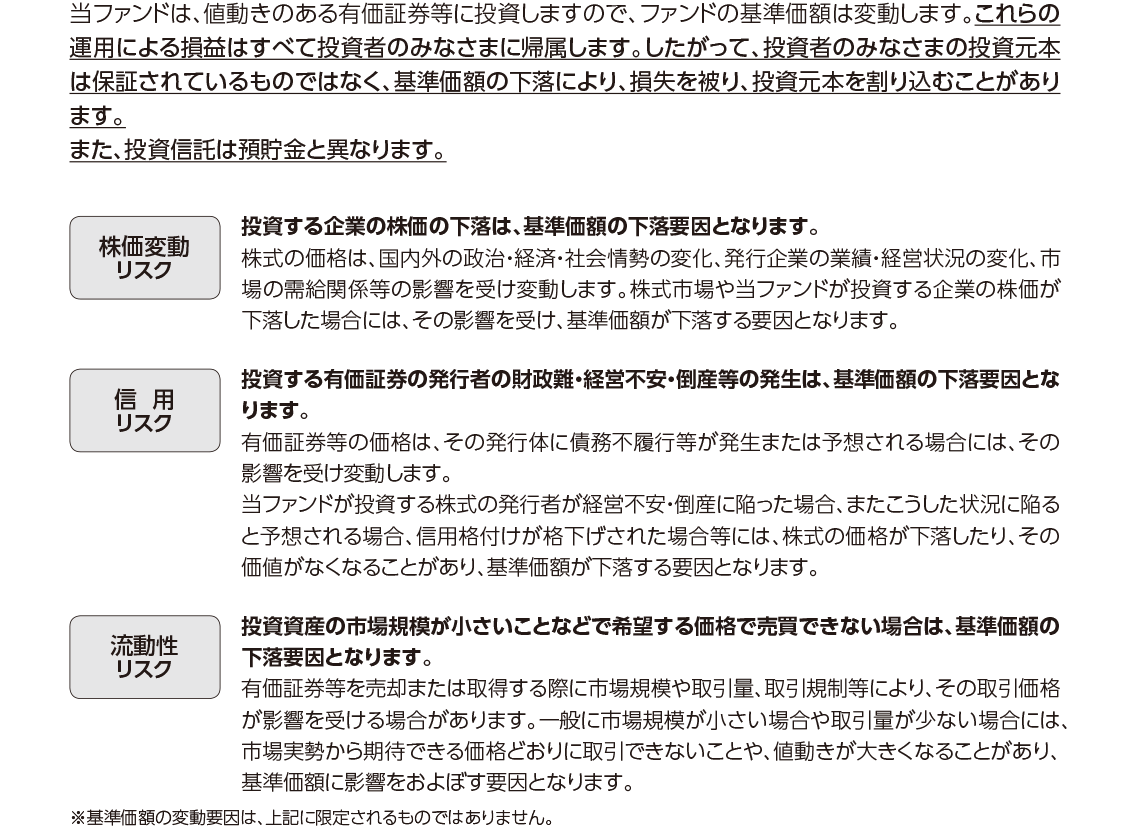 投資信託は、株式や債券等の値動きのある有価証券(外貨建資産には為替リスクもあります)に投資をしますので、市場環境、組入有価証券の発行者に係る信用状況等の変化により基準価額は変動します。このため、購入金額について元本保証および利回り保証のいずれもありません。