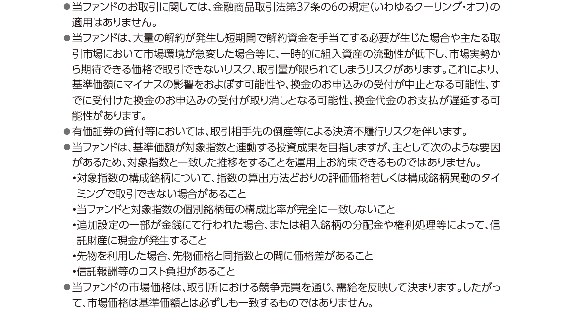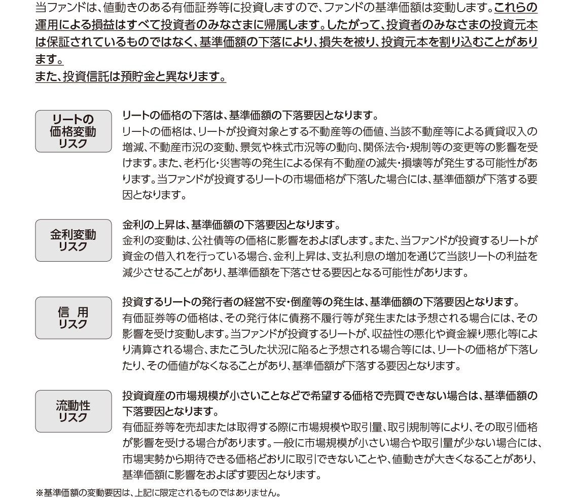 運用状況によっては、分配金額が変わる場合、あるいは分配金が支払われない場合があります。投資信託は、預金等や保険契約ではありません。また、預金保険機構および保険契約者保護機構の保護の対象ではありません。加えて証券会社を通して購入していない場合には投資者保護基金の対象にもなりません。購入金額については元本保証および利回り保証のいずれもありません。投資した資産の価値が減少して購入金額を下回る場合がありますが、これによる損失は購入者が負担することとなります。