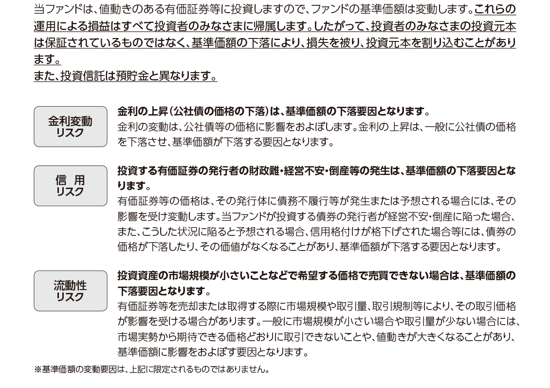 本ウェブサイトは、アセットマネジメントOne株式会社が作成したものです。お申込に際しては、投資信託説明書(交付目論見書)をあらかじめ、または同時にお渡し致しますので、必ず内容をご確認の上、ご自身でご判断ください。投資信託は、株式や債券等の値動きのある有価証券(外貨建資産には為替リスクもあります)に投資をしますので、市場環境、組入有価証券の発行者に係る信用状況等の変化により基準価額は変動します。このため、購入金額について元本保証および利回り保証のいずれもありません。本ウェブサイトは、アセットマネジメントOne株式会社が信頼できると判断したデータにより作成しておりますが、その内容の完全性、正確性について同社が保証するものではありません。また、掲載データは過去の実績であり、将来の運用成果を保証するものではありません。 本ウェブサイトに掲載されている情報(リンクされている外部サイトの情報も含む)に基づいて被ったいかなる損害についても一切の責任を負いません。本ウェブサイトの内容は作成時点のものであり、今後予告なく変更される場合があります。本ウェブサイトに記載した当社の見通し等は、将来の景気や株価等の動きを保証するものではありません。基準価額・分配金再投資基準価額・分配金込み基準価額は信託報酬控除後の価額です。当初元本が1口1円のファンドについては1万口当たりの価額を、それ以外のファンドについては1口あたりの価額を表示しています。換金時の費用・税金等は考慮しておりません。ただし、ETFの表記している口数については別途ご確認ください。分配金の表示数値は、基準価額の表示口数当たり課税前の金額です。表示方法については、公社債投信は小数点第二位まで、その他のファンドは整数部のみとしているため、実際の分配金額と表示上の差異が生じることがあります。運用状況によっては、分配金額が変わる場合、あるいは分配金が支払われない場合があります。投資信託は、預金等や保険契約ではありません。また、預金保険機構および保険契約者保護機構の保護の対象ではありません。加えて証券会社を通して購入していない場合には投資者保護基金の対象にもなりません。購入金額については元本保証および利回り保証のいずれもありません。投資した資産の価値が減少して購入金額を下回る場合がありますが、これによる損失は購入者が負担することとなります。