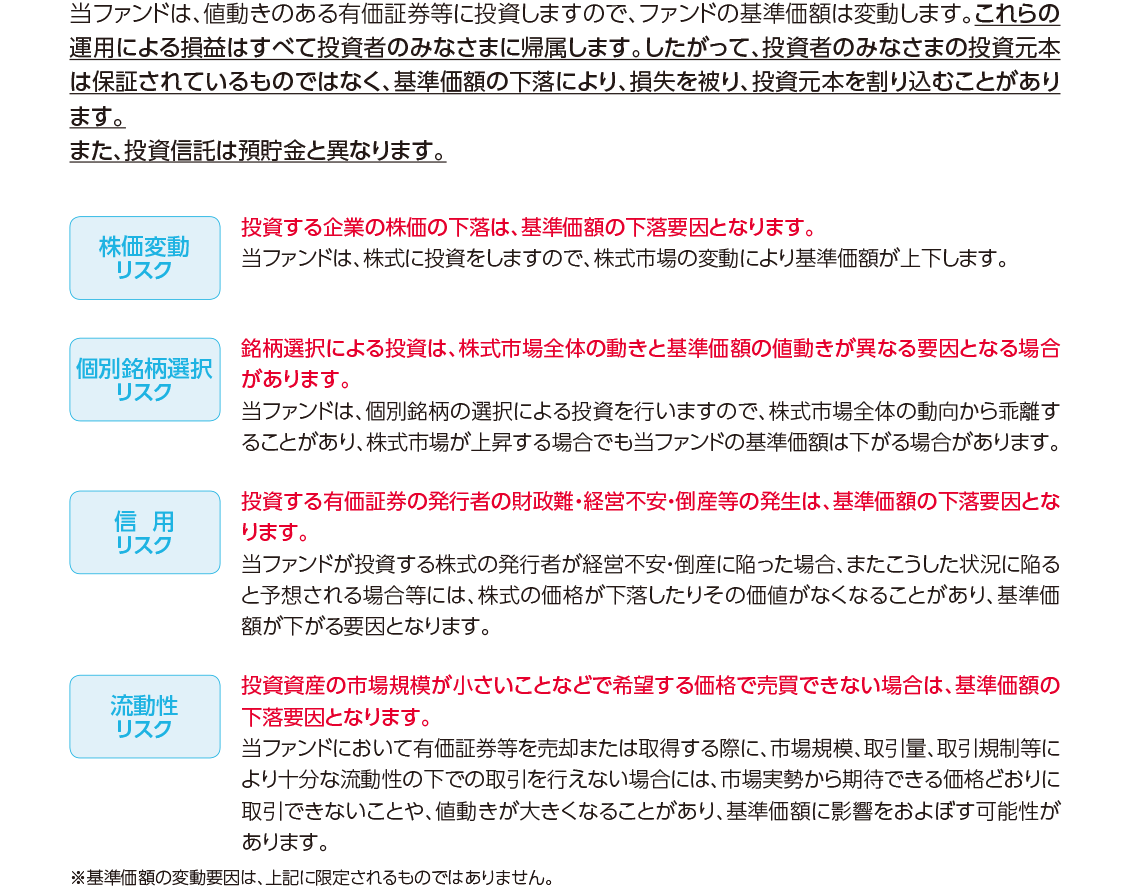 投資信託は、株式や債券等の値動きのある有価証券(外貨建資産には為替リスクもあります)に投資をしますので、市場環境、組入有価証券の発行者に係る信用状況等の変化により基準価額は変動します。このため、購入金額について元本保証および利回り保証のいずれもありません。