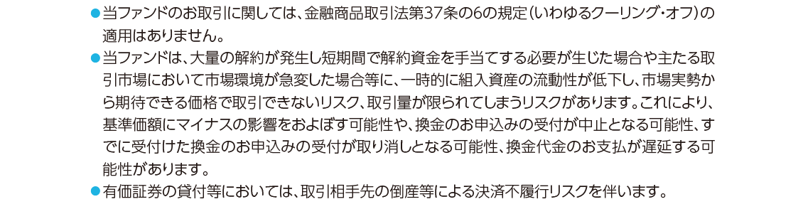運用状況によっては、分配金額が変わる場合、あるいは分配金が支払われない場合があります。投資信託は、預金等や保険契約ではありません。また、預金保険機構および保険契約者保護機構の保護の対象ではありません。加えて証券会社を通して購入していない場合には投資者保護基金の対象にもなりません。購入金額については元本保証および利回り保証のいずれもありません。投資した資産の価値が減少して購入金額を下回る場合がありますが、これによる損失は購入者が負担することとなります。