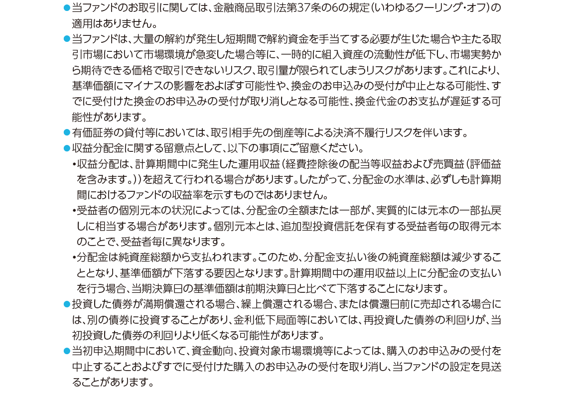 運用状況によっては、分配金額が変わる場合、あるいは分配金が支払われない場合があります。投資信託は、預金等や保険契約ではありません。また、預金保険機構および保険契約者保護機構の保護の対象ではありません。加えて証券会社を通して購入していない場合には投資者保護基金の対象にもなりません。購入金額については元本保証および利回り保証のいずれもありません。投資した資産の価値が減少して購入金額を下回る場合がありますが、これによる損失は購入者が負担することとなります。