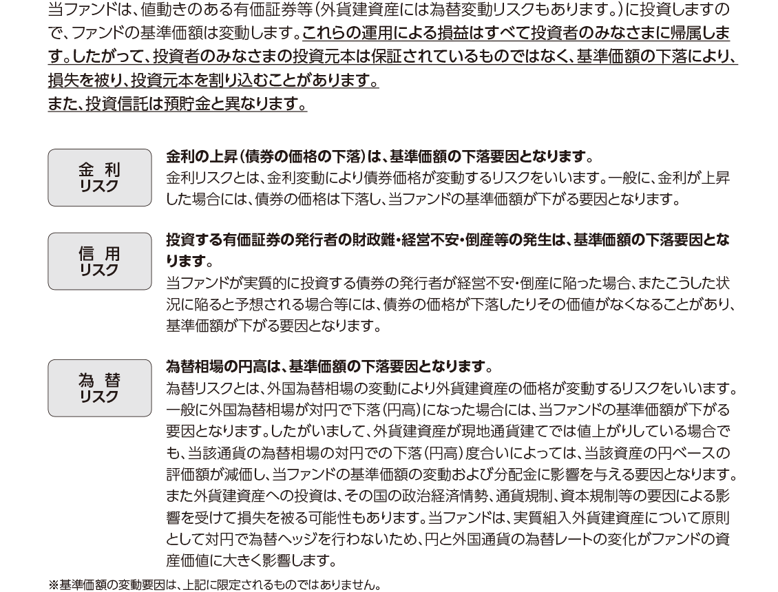 投資信託は、株式や債券等の値動きのある有価証券(外貨建資産には為替リスクもあります)に投資をしますので、市場環境、組入有価証券の発行者に係る信用状況等の変化により基準価額は変動します。このため、購入金額について元本保証および利回り保証のいずれもありません。