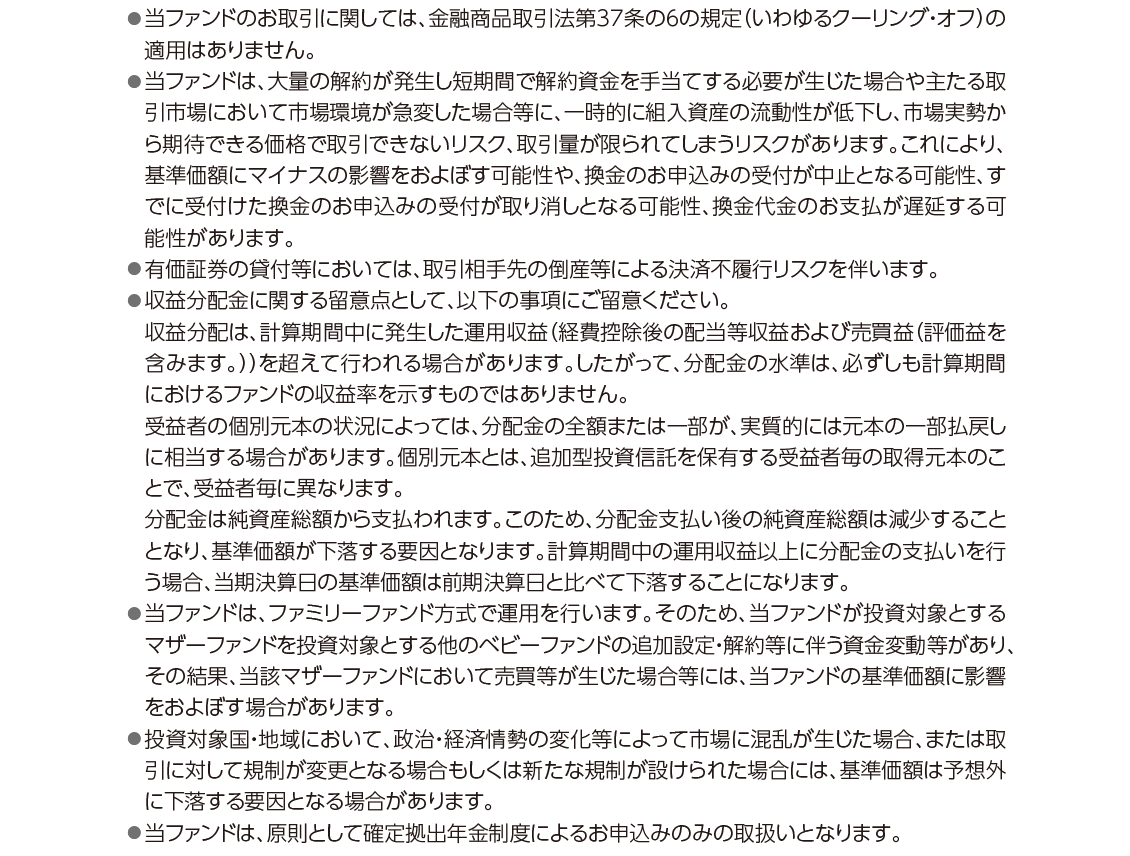 運用状況によっては、分配金額が変わる場合、あるいは分配金が支払われない場合があります。投資信託は、預金等や保険契約ではありません。また、預金保険機構および保険契約者保護機構の保護の対象ではありません。加えて証券会社を通して購入していない場合には投資者保護基金の対象にもなりません。購入金額については元本保証および利回り保証のいずれもありません。投資した資産の価値が減少して購入金額を下回る場合がありますが、これによる損失は購入者が負担することとなります。