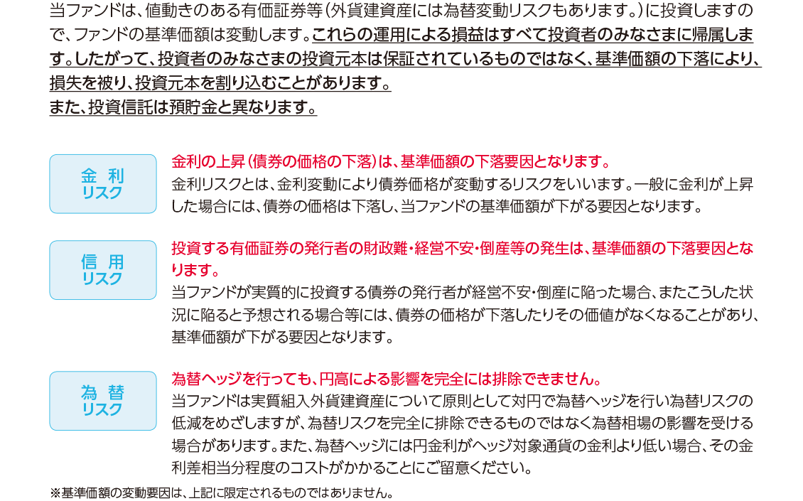 投資信託は、株式や債券等の値動きのある有価証券(外貨建資産には為替リスクもあります)に投資をしますので、市場環境、組入有価証券の発行者に係る信用状況等の変化により基準価額は変動します。このため、購入金額について元本保証および利回り保証のいずれもありません。