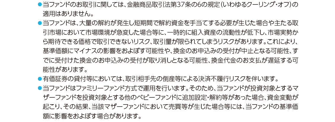運用状況によっては、分配金額が変わる場合、あるいは分配金が支払われない場合があります。投資信託は、預金等や保険契約ではありません。また、預金保険機構および保険契約者保護機構の保護の対象ではありません。加えて証券会社を通して購入していない場合には投資者保護基金の対象にもなりません。購入金額については元本保証および利回り保証のいずれもありません。投資した資産の価値が減少して購入金額を下回る場合がありますが、これによる損失は購入者が負担することとなります。