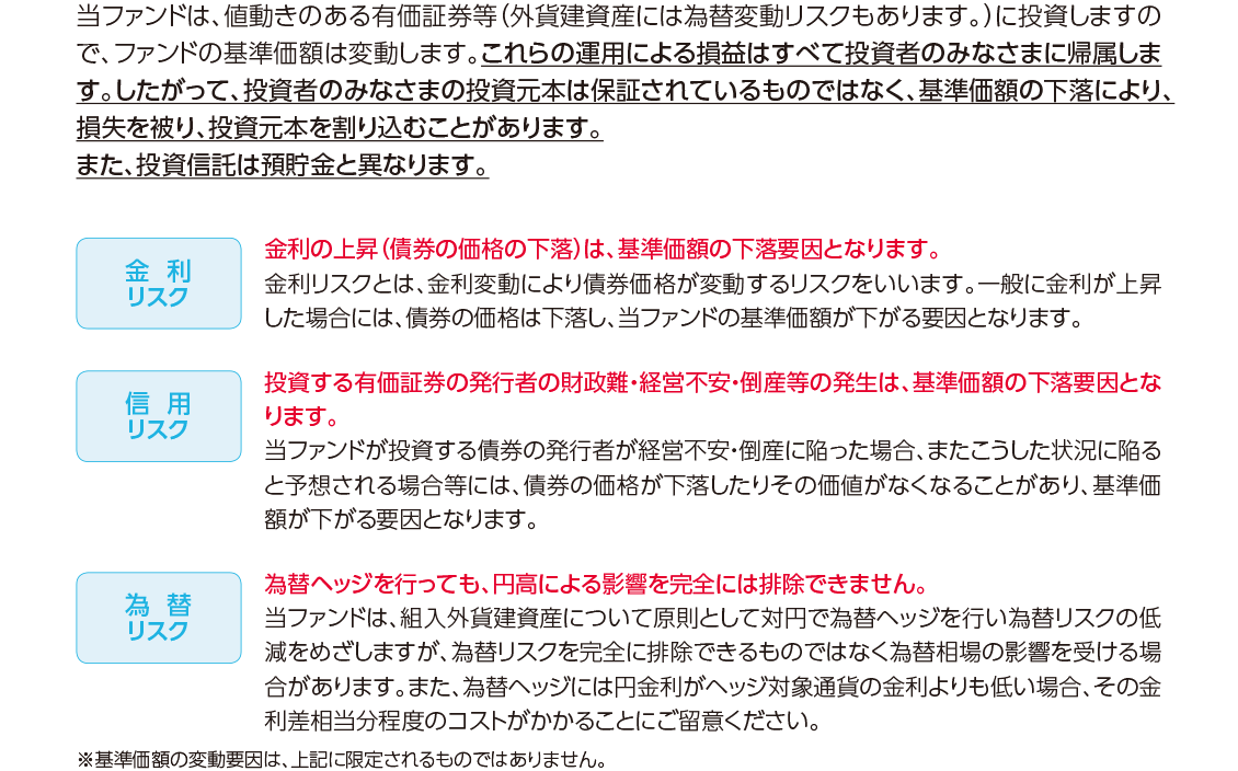 投資信託は、株式や債券等の値動きのある有価証券(外貨建資産には為替リスクもあります)に投資をしますので、市場環境、組入有価証券の発行者に係る信用状況等の変化により基準価額は変動します。このため、購入金額について元本保証および利回り保証のいずれもありません。