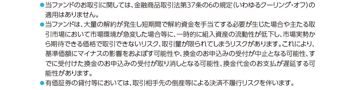 運用状況によっては、分配金額が変わる場合、あるいは分配金が支払われない場合があります。投資信託は、預金等や保険契約ではありません。また、預金保険機構および保険契約者保護機構の保護の対象ではありません。加えて証券会社を通して購入していない場合には投資者保護基金の対象にもなりません。購入金額については元本保証および利回り保証のいずれもありません。投資した資産の価値が減少して購入金額を下回る場合がありますが、これによる損失は購入者が負担することとなります。