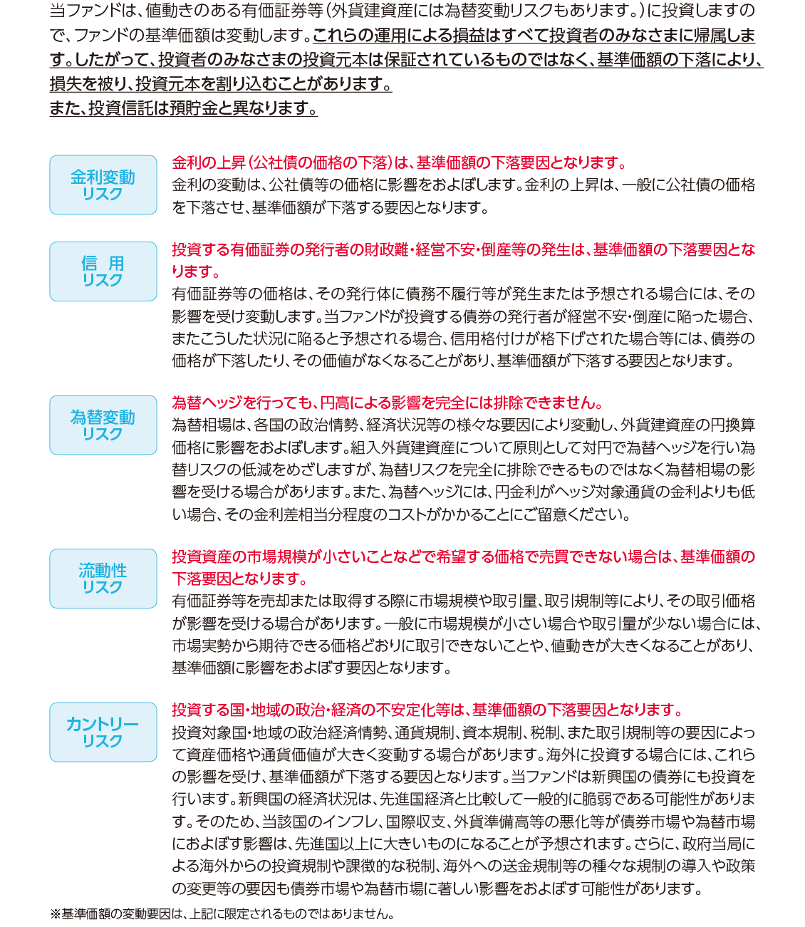 投資信託は、株式や債券等の値動きのある有価証券(外貨建資産には為替リスクもあります)に投資をしますので、市場環境、組入有価証券の発行者に係る信用状況等の変化により基準価額は変動します。このため、購入金額について元本保証および利回り保証のいずれもありません。