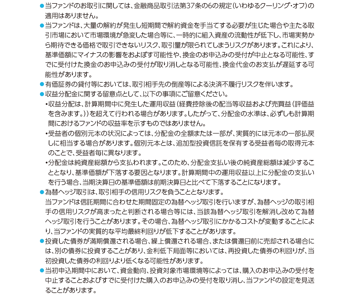 運用状況によっては、分配金額が変わる場合、あるいは分配金が支払われない場合があります。投資信託は、預金等や保険契約ではありません。また、預金保険機構および保険契約者保護機構の保護の対象ではありません。加えて証券会社を通して購入していない場合には投資者保護基金の対象にもなりません。購入金額については元本保証および利回り保証のいずれもありません。投資した資産の価値が減少して購入金額を下回る場合がありますが、これによる損失は購入者が負担することとなります。
