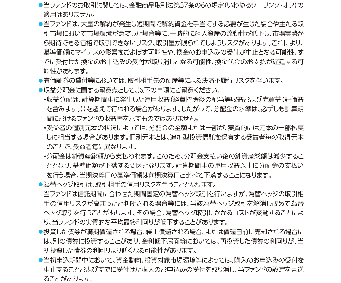 運用状況によっては、分配金額が変わる場合、あるいは分配金が支払われない場合があります。投資信託は、預金等や保険契約ではありません。また、預金保険機構および保険契約者保護機構の保護の対象ではありません。加えて証券会社を通して購入していない場合には投資者保護基金の対象にもなりません。購入金額については元本保証および利回り保証のいずれもありません。投資した資産の価値が減少して購入金額を下回る場合がありますが、これによる損失は購入者が負担することとなります。
