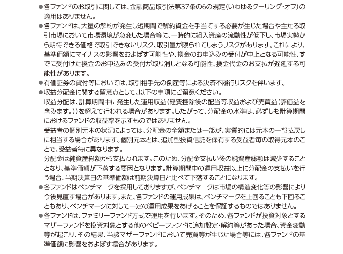 運用状況によっては、分配金額が変わる場合、あるいは分配金が支払われない場合があります。投資信託は、預金等や保険契約ではありません。また、預金保険機構および保険契約者保護機構の保護の対象ではありません。加えて証券会社を通して購入していない場合には投資者保護基金の対象にもなりません。購入金額については元本保証および利回り保証のいずれもありません。投資した資産の価値が減少して購入金額を下回る場合がありますが、これによる損失は購入者が負担することとなります。