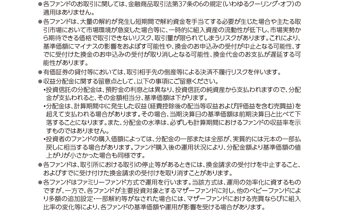 運用状況によっては、分配金額が変わる場合、あるいは分配金が支払われない場合があります。投資信託は、預金等や保険契約ではありません。また、預金保険機構および保険契約者保護機構の保護の対象ではありません。加えて証券会社を通して購入していない場合には投資者保護基金の対象にもなりません。購入金額については元本保証および利回り保証のいずれもありません。投資した資産の価値が減少して購入金額を下回る場合がありますが、これによる損失は購入者が負担することとなります。