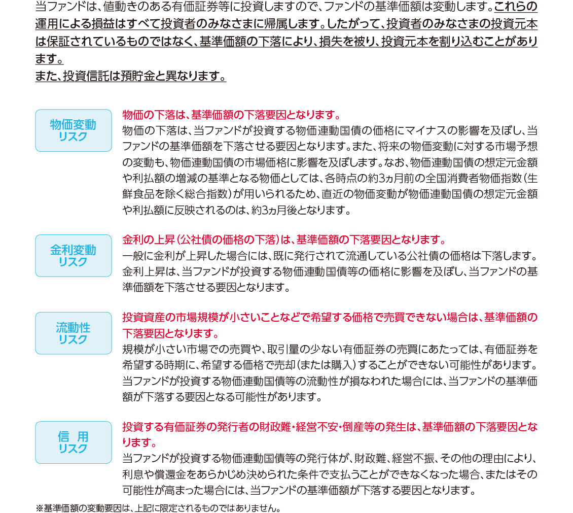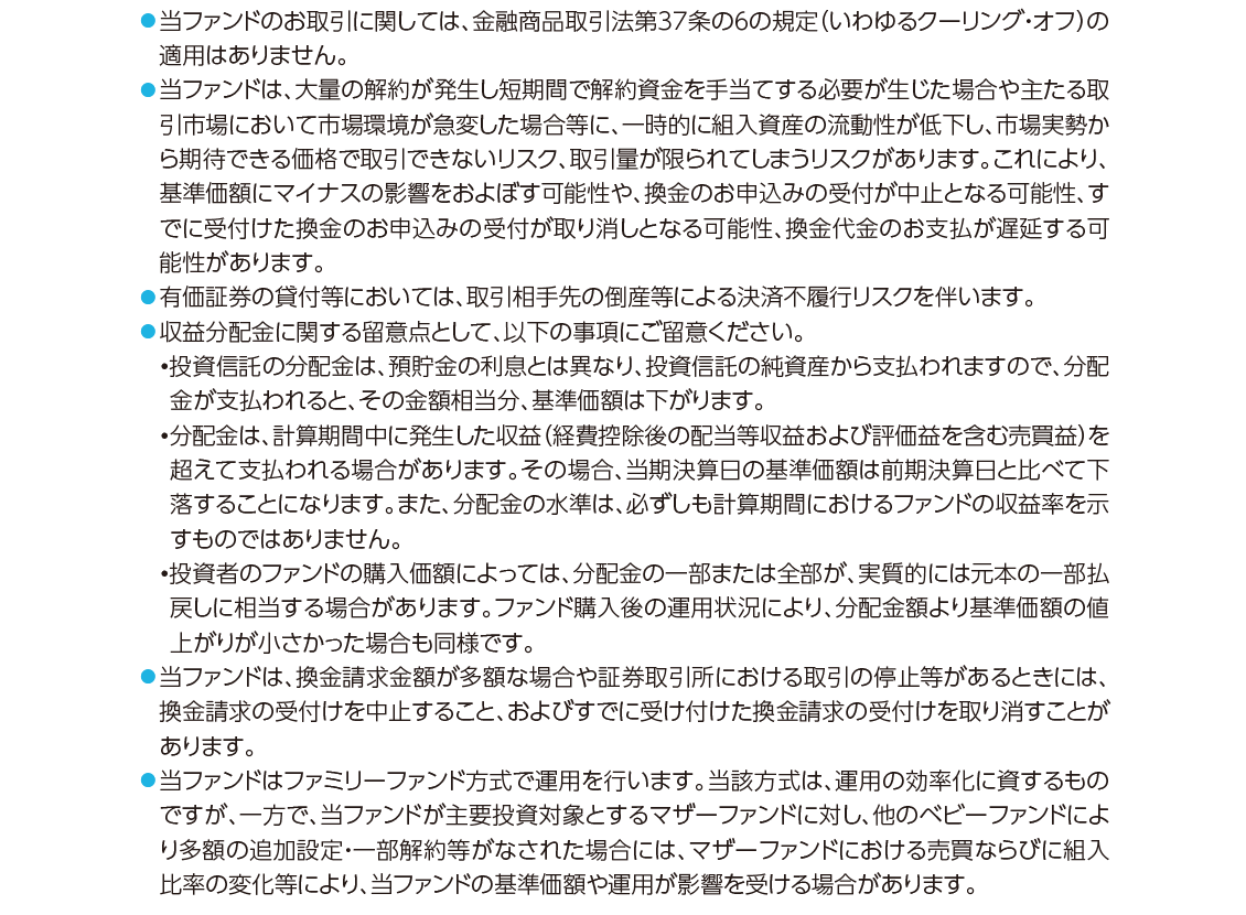 運用状況によっては、分配金額が変わる場合、あるいは分配金が支払われない場合があります。投資信託は、預金等や保険契約ではありません。また、預金保険機構および保険契約者保護機構の保護の対象ではありません。加えて証券会社を通して購入していない場合には投資者保護基金の対象にもなりません。購入金額については元本保証および利回り保証のいずれもありません。投資した資産の価値が減少して購入金額を下回る場合がありますが、これによる損失は購入者が負担することとなります。