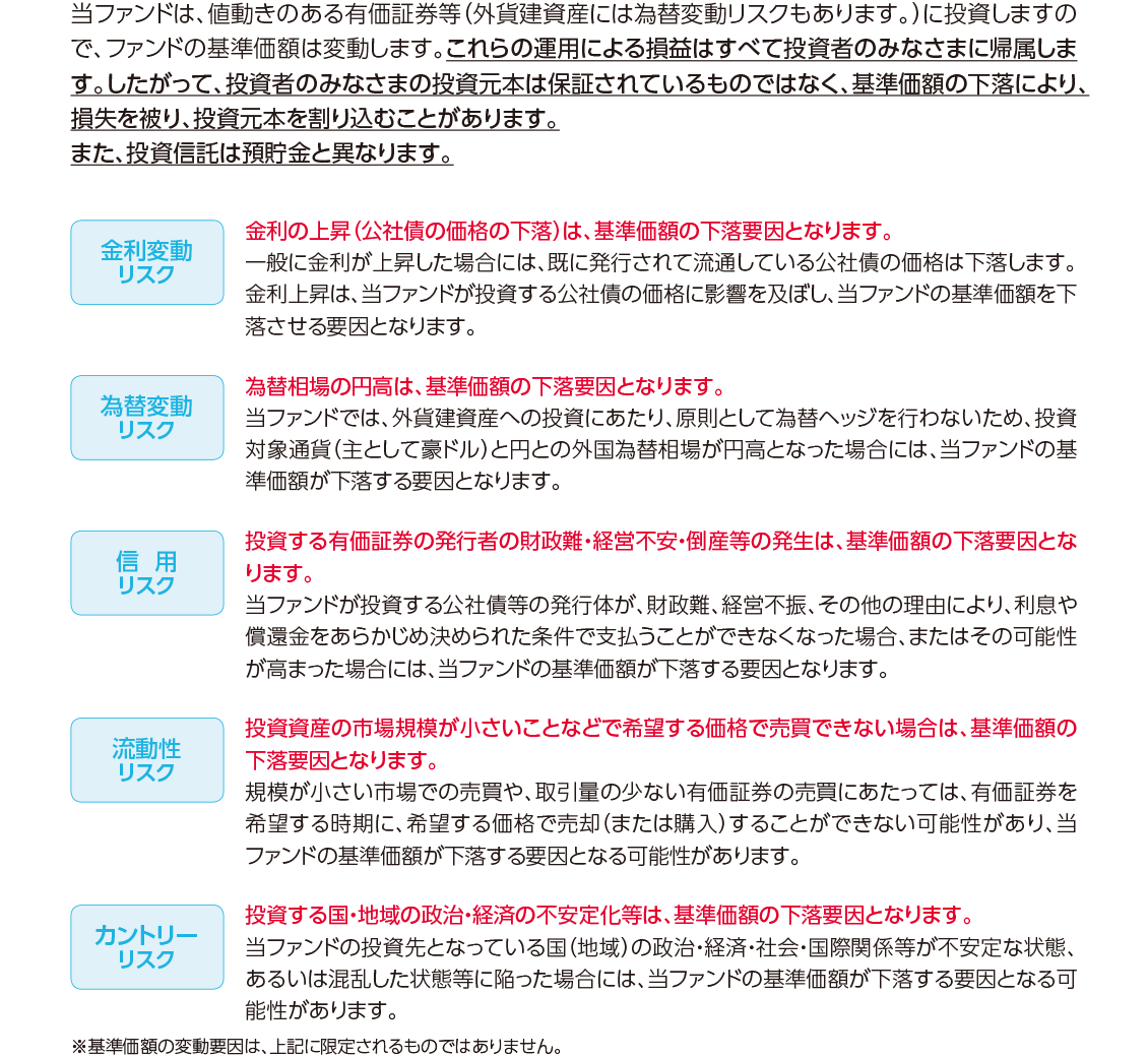 投資信託は、株式や債券等の値動きのある有価証券(外貨建資産には為替リスクもあります)に投資をしますので、市場環境、組入有価証券の発行者に係る信用状況等の変化により基準価額は変動します。このため、購入金額について元本保証および利回り保証のいずれもありません。