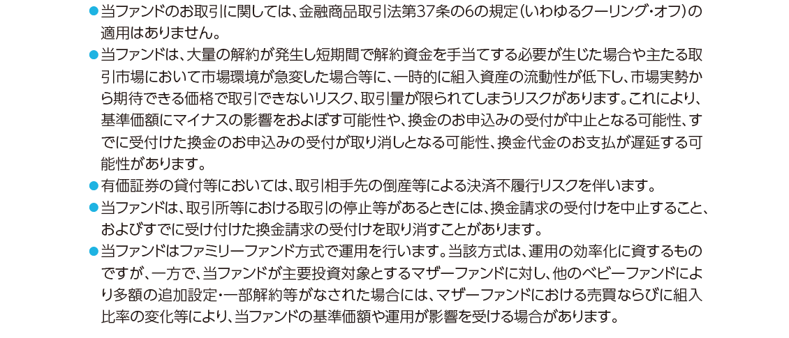 運用状況によっては、分配金額が変わる場合、あるいは分配金が支払われない場合があります。投資信託は、預金等や保険契約ではありません。また、預金保険機構および保険契約者保護機構の保護の対象ではありません。加えて証券会社を通して購入していない場合には投資者保護基金の対象にもなりません。購入金額については元本保証および利回り保証のいずれもありません。投資した資産の価値が減少して購入金額を下回る場合がありますが、これによる損失は購入者が負担することとなります。