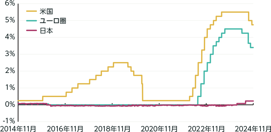 日本の相対的に低い金利水準2022年より、物価上昇を背景に先進各国は政策金利の引き上げを行った一方で、日本は金融緩和を継続しました。このような金融政策の違いに着目した日本株市場への資金流入が株価を押し上げました。