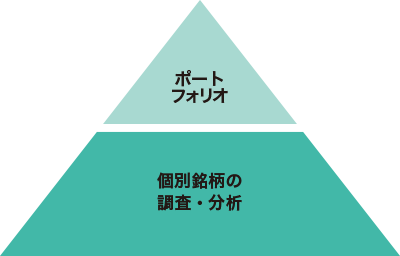 一方、ボトムアップアプローチは、個別企業の将来の成長性や財務内容などファンダメンタルズを調査・分析することにより銘柄の割高・割安などの投資価値を判断して銘柄を決定する運用手法です。トップダウンアプローチのイメージ