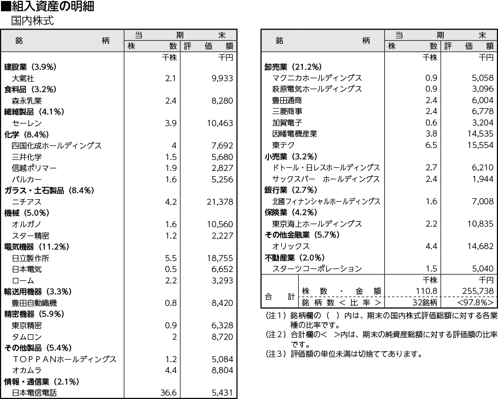 運用報告書(全体版)では保有全銘柄に加え、評価額から組入比率の大きい銘柄が確認できます。また、第2期決算以降は前期末と当期末の両方の株数が記載されるため、当期に新規で組み入れた銘柄や買い増した銘柄なども分かります。