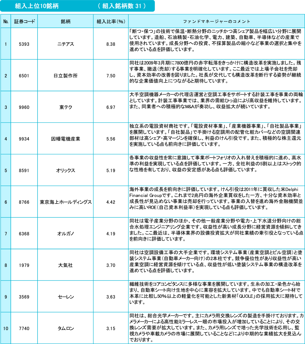 例えば、構造改革ジャパンの月次レポートによると2024年10月末時点の組入比率1位の銘柄はニチアスという保温・断熱分野のニッチかつ高シェア製品を幅広い分野に展開する企業です。コメント欄には同社の特徴や強みの他、投資理由についても触れられています。