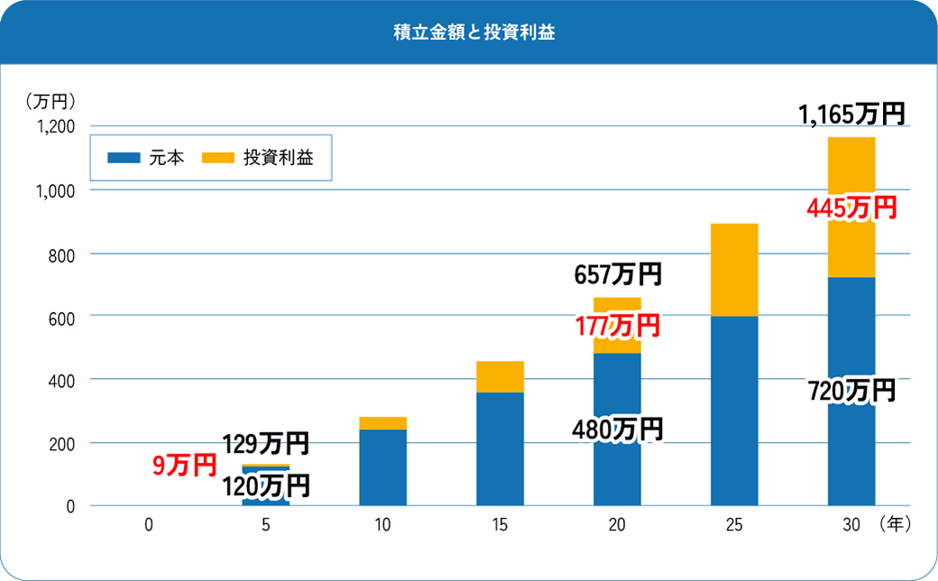 例えば、毎月2万円、投資利回り年率3%の積立投資を想定します。この時の投資利益は5年間で約9万円、20年間で約177万円、30年間で約445万円になります。