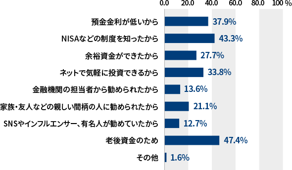 将来のお金の不安を持った人がNISAなどの税制優遇制度を知ったことが投資のきっかけになっていると思われます。