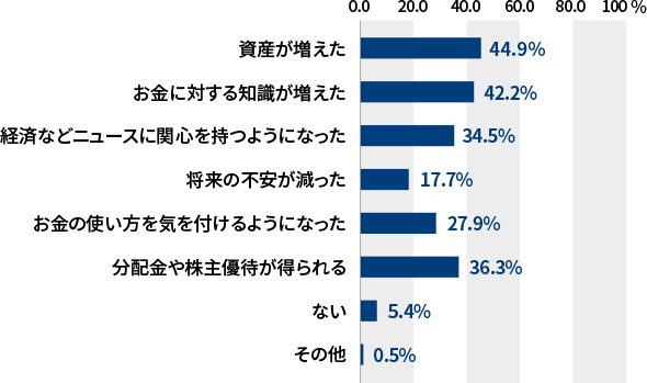 次いで「お金に対する知識が増えた」と回答する人も多くなっており、投資を行ったことで、将来必要となるお金やどのように資産を増やすか考えるきっかけになったともいえそうです。また「ない」と回答した人は5%程度と、投資を始めてよかったことが具体的にある人がほとんどでした。